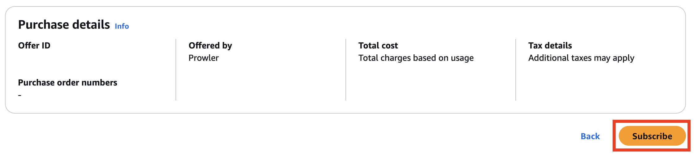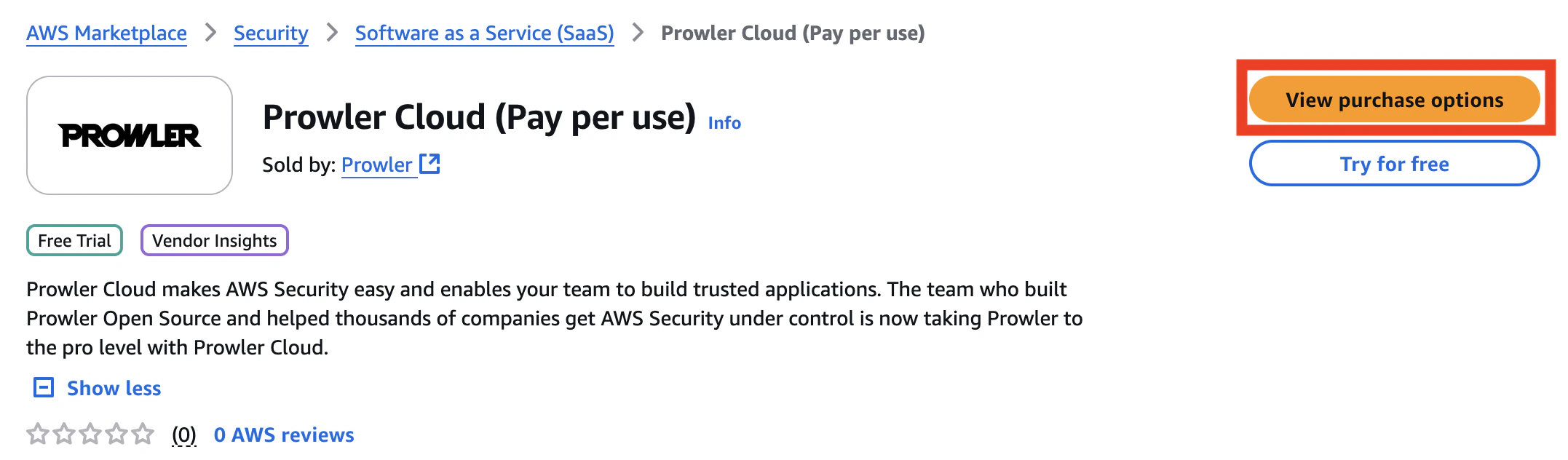 To get to the Prowler Cloud product listing in the AWS Marketplace, and click theView purchase options button: