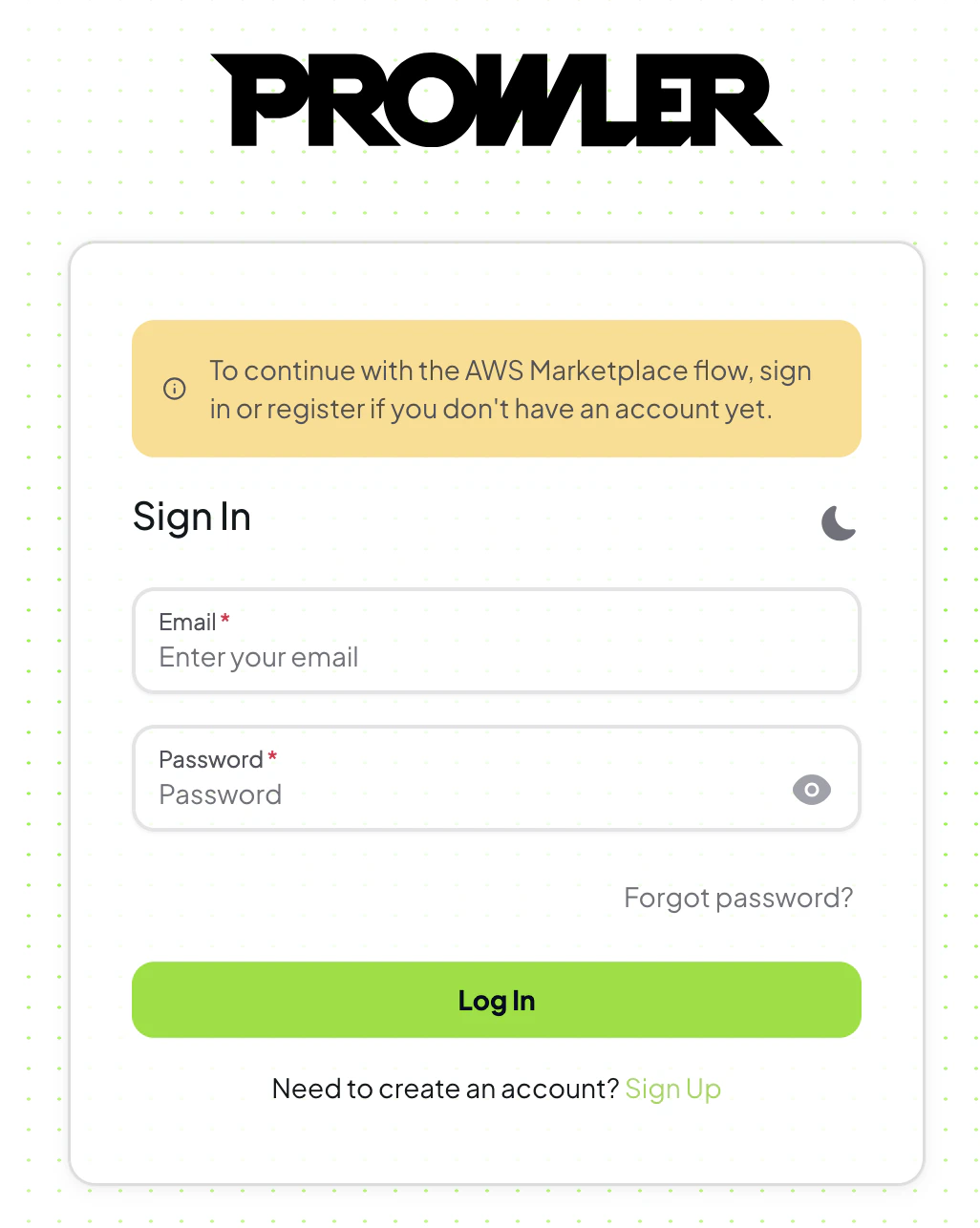 You will be redirected to Prowler Cloud Sign In page. You can sign in with an exsiting account or sign up with a new account.:
